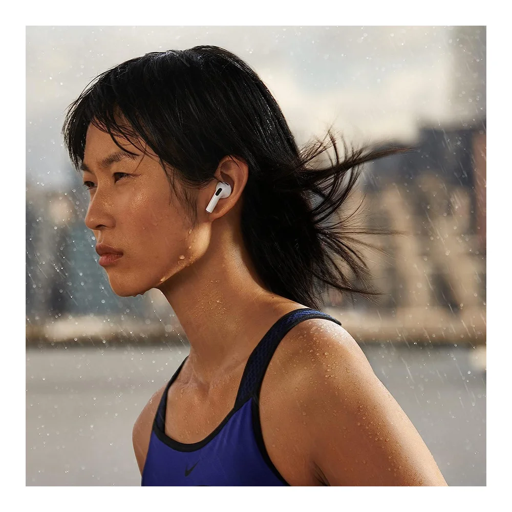 Spatial Audio works with movies, TV, and video in supported apps. iPhone with TrueDepth camera required to create personalized profile. Battery life varies by use and configuration. AirPods (3rd generation) are sweat and water resistant for non-water sports and exercise, and they are IPX4 rated. Sweat and water resistance are not permanent conditions. Siri may not be available in all languages or in all areas, and features may vary by area. Internet access required. Cellular data charges may apply. Requires an iCloud account and a compatible Apple device running the latest operating system software. Works with iPhone 8 or later and iPod touch (7th generation) with the latest version of iOS; and 12.9-inch iPad Pro (2nd generation or later), 11-inch iPad Pro, 10.5-inch iPad Pro, iPad (5th generation or later), iPad Air (3rd generation or later), and iPad mini (5th generation or later) with the latest version of iPadOS.